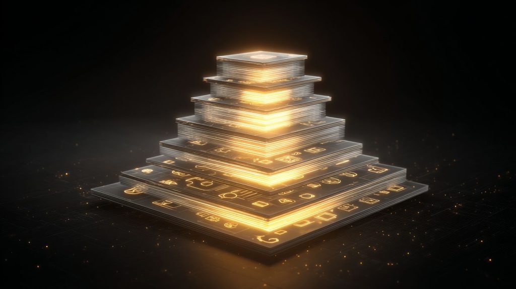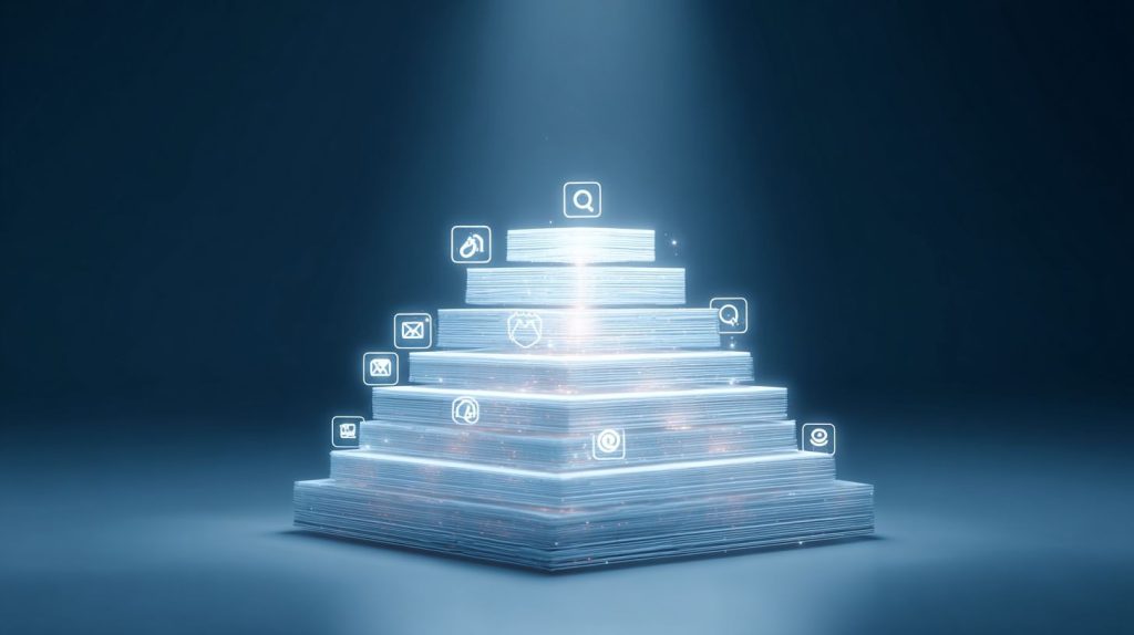 Four progressive layers build compounding authority signals recognized by knowledge graphs. This framework stacks foundational depth on pillar pages, adds topical signals through clusters, connects entity networks, and masters user intent. AI crawlers prioritize sites with this layered authority for better search visibility.